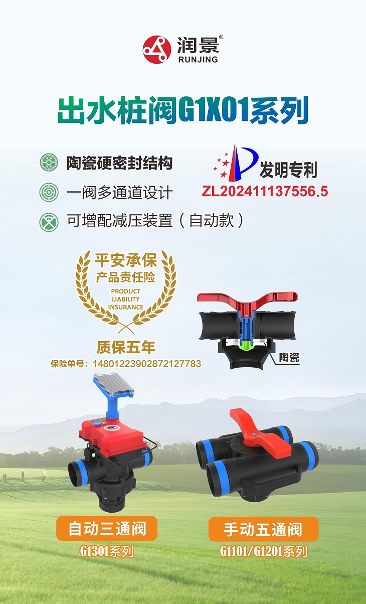 目前,潤(rùn)景出水樁閥有三通、五通、單路出水、雙路出水和手動(dòng)、4G、LORA自動(dòng)控制等多種規(guī)格型號(hào),進(jìn)水端可選3寸或4寸,還可選帶流量計(jì)接頭、帶卡箍接頭、帶減壓裝置、太陽能板天線外掛等功能,滿足不同灌溉場(chǎng)景使用需求。