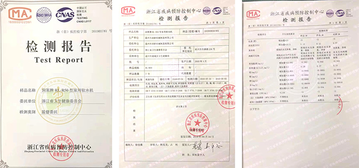 檢測結(jié)果顯示RL-R50型潤萊軟水機(jī)的色度、渾濁度、臭和味、肉眼可見物、揮發(fā)酚類、含氧量(以O2計)、鉛、鎘、鉻(六價)、砷、汞、菌落總數(shù)、(總)大腸菌群、耐熱大腸菌群等項(xiàng)目全部合格,再一次證明了潤萊產(chǎn)品的衛(wèi)生安全性和品質(zhì)可靠性。
