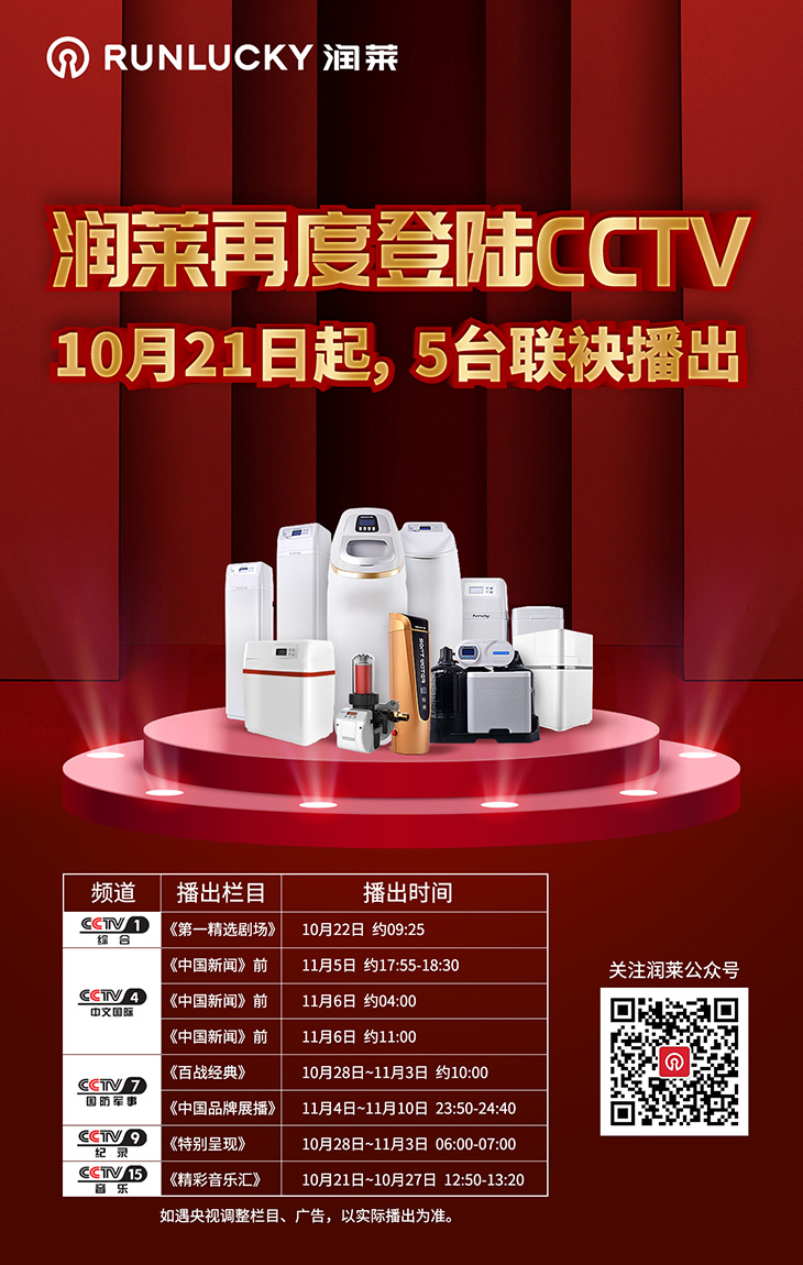 10月21日,潤萊軟水機(jī)廣告繼7月份在CCTV-2和CCTV-7播出之后,再度與央視權(quán)威媒體合作,強(qiáng)勢登陸CCTV-1、CCTV-4、CCTV-7、CCTV-9、CCTV-15,五臺聯(lián)袂播出。